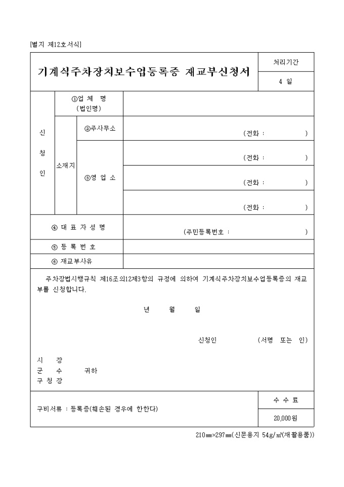 9,000원/월주차장법시행규칙 제16조의12제3항의 규정에 의하여 기계식주차장치보수업등록증의 재교부를 신청하기 위한 서식으로써 구비해야 하는 서류로는 등록증(훼손된 경우에 한한다)이 있고 수수료는 20,000원입니다.