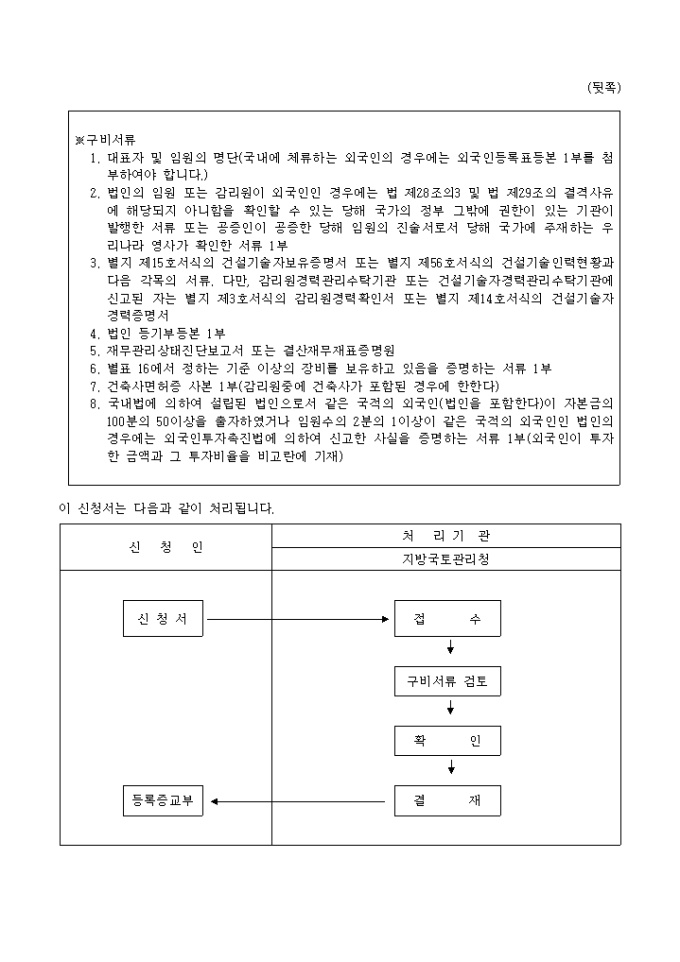 건설기술관리법 제28조의 규정에 의하여 위와 같이 감리전문회사 등록을 신청하기 위한 서식으로써 신청인의 인적사항, 감리종류, 기술인력, 자본금 및 자산평가액, 임원, 장비의 등록사항등을 기재해야 하며 처리기간은 30일입니다.