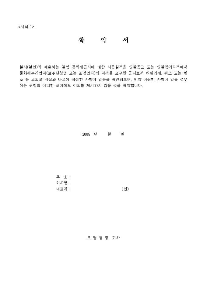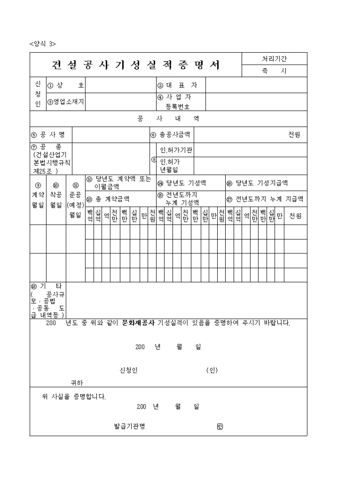 9,000원/월확약서, 시공실적 집계표, 시공실적증명(확 인)서, 건설공사기 성실적증명서의 4개의 양식으로 이루어져 있는 문화재 공사 시공실적 서식입니다.