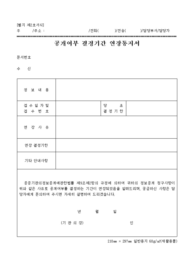 9,000원/월공공기관의정보공개에관한법률 제9조제2항의 규정에 의하여 귀하의 정보공개 청구사항의 공개여부를 결정하는 기간이 연장되었음을 통지하는 서식입니다.