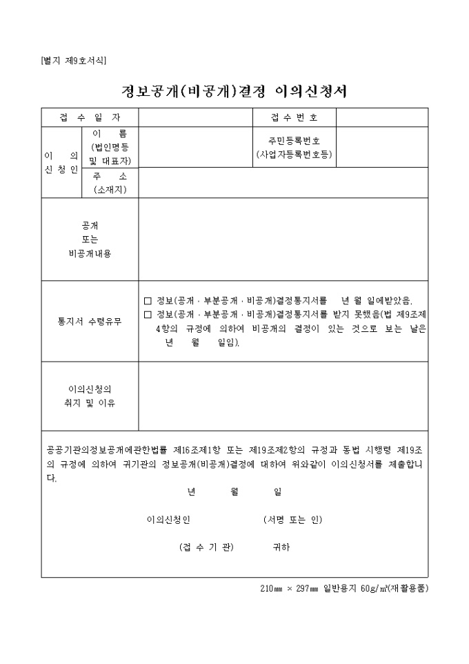 정보공개(비공개)결정 이의신청서(별지 제9호서식)