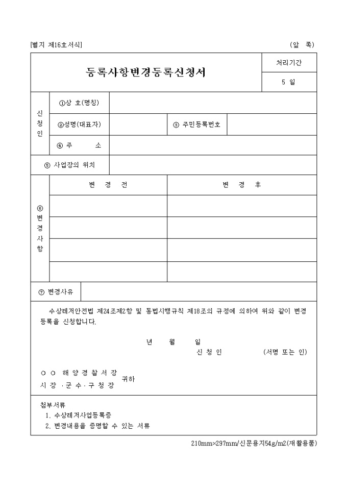 *첨부서류 : 수상레저사업등록증, 변경내용을 증명할 수 있는 서류
