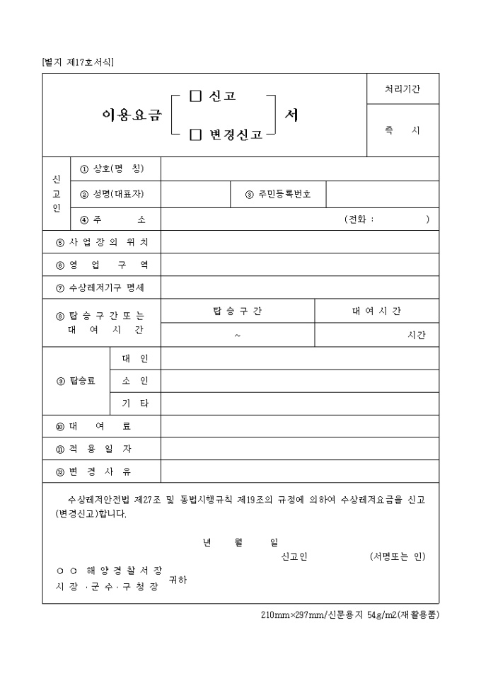 9,000원/월수상레저안전법 제27조 및 동법시행규칙 제19조의 규정에 의거한 이용요금 신고 및 변경신고서로 신고인 인적사항, 사업장의 위치, 영업구역, 수상레저기구명세, 탑승구간 또는 대여시간 등을 기재합니다.