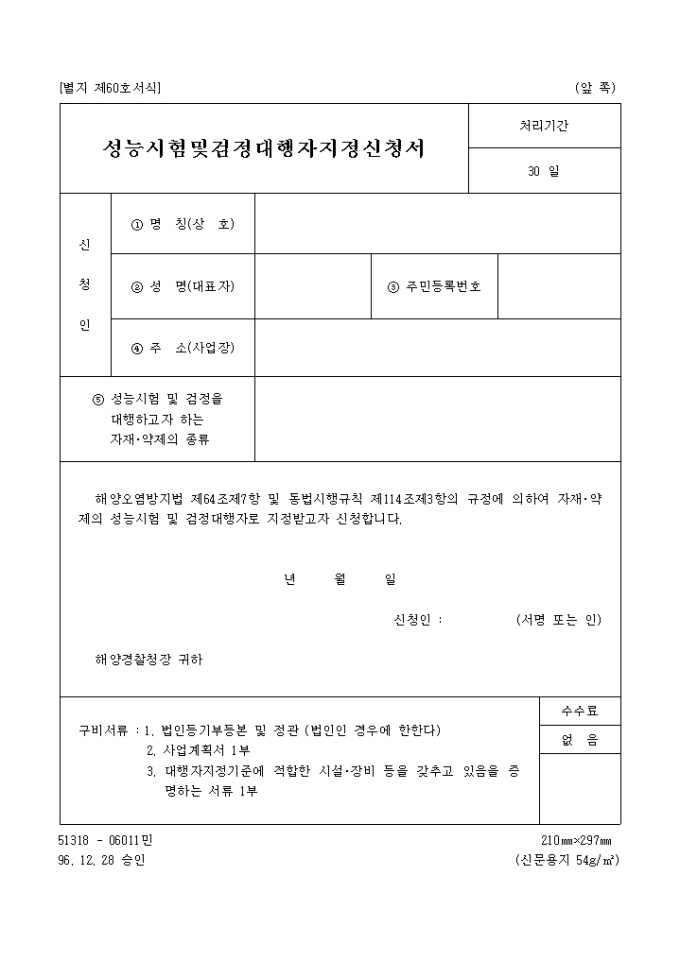 9,000원/월*해양오염방지법 제64조제7항 및 동법시행규칙 제114조제3항의 규정에 의거한 성능시험 및 검정대행자 지정신청서 입니다.