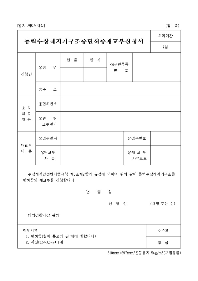 9,000원/월수상레저안전법시행규칙 제5조제2항의 규정에 의거한 동력수상레저기구조종면허증재교부신청서로서 면허증(헐어 못쓰게 된 때에 한합니다), 사진(2.5×3.5㎝) 1매가 첨부되어야 합니다.