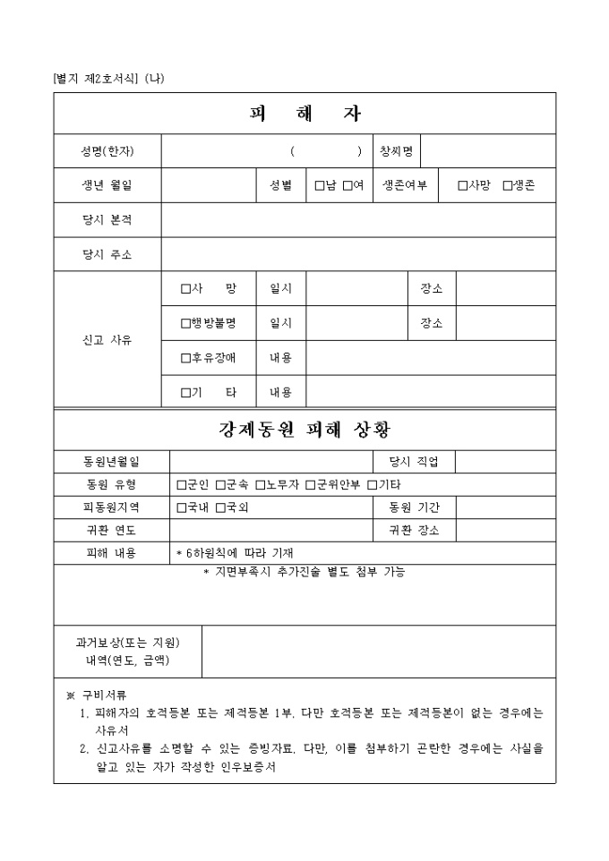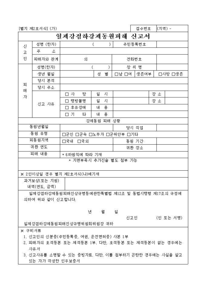 일제강점하강제동원피해진상규명등에관한특별법 제12조 및 동법시행령 제17조의 규정에 의거한 신고서로서 신고인의 신분증(주민등록증, 여권, 운전면허증) 사본 1부, 피해자의 호적등본 또는 제적등본 1부(다만, 호적등본 또는 제적등본이 없는 경우에는 사유서), 신고사유를 소명할 수 있는 증빙자료(다만, 이를 첨부하기 곤란한 경우에는 사실을 알고 있는 자가 작성한 인우보증서)가 구비되어야 합니다.