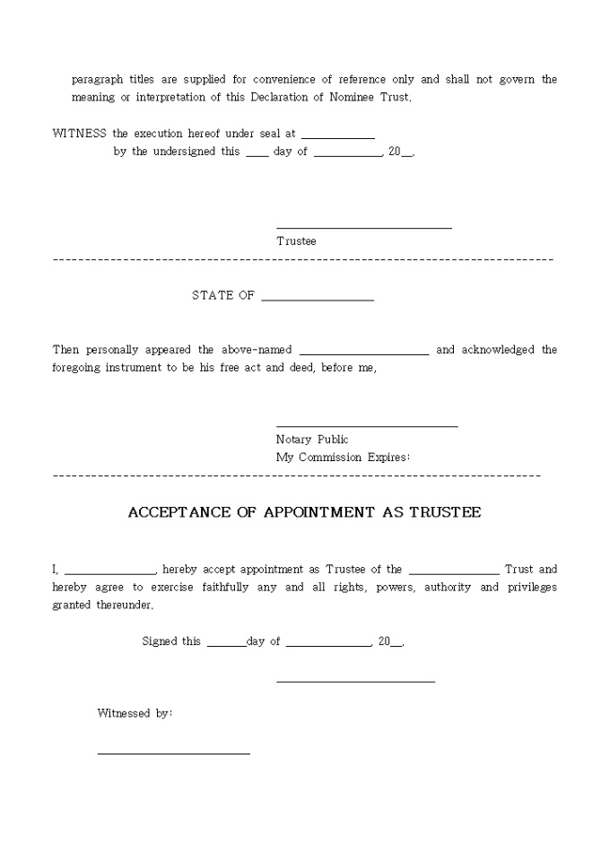 9,000원/월DECLARATION OF NOMINEE TRUST양식입니다. 아래는 전체내용중 일부분입니다. The undersigned, ___________________ of __________ County, State of _____________ (the "Trustee" hereunder), hereby declares that any and all property and interest