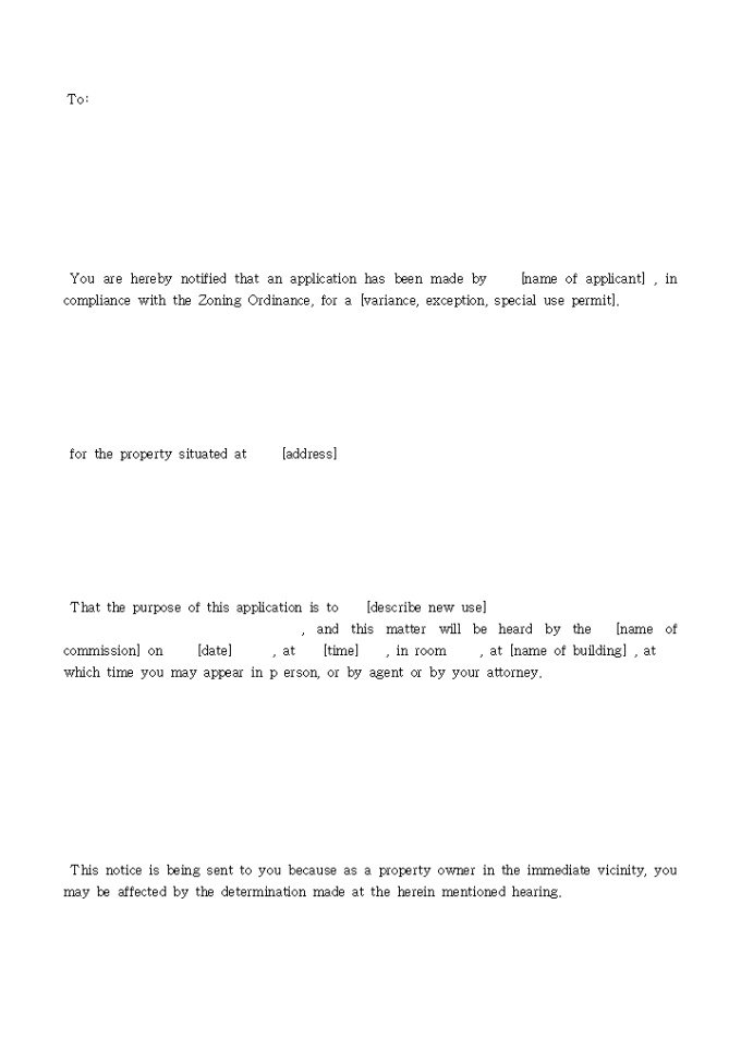 Notice of Zoning Appeal입니다.아래는 전체내용중 일부분입니다. You are hereby notified that an application has been made by [name of applicant] , in compliance with the Zoning Ordinance, for a [variance, exception, special use permit]. for the property situated