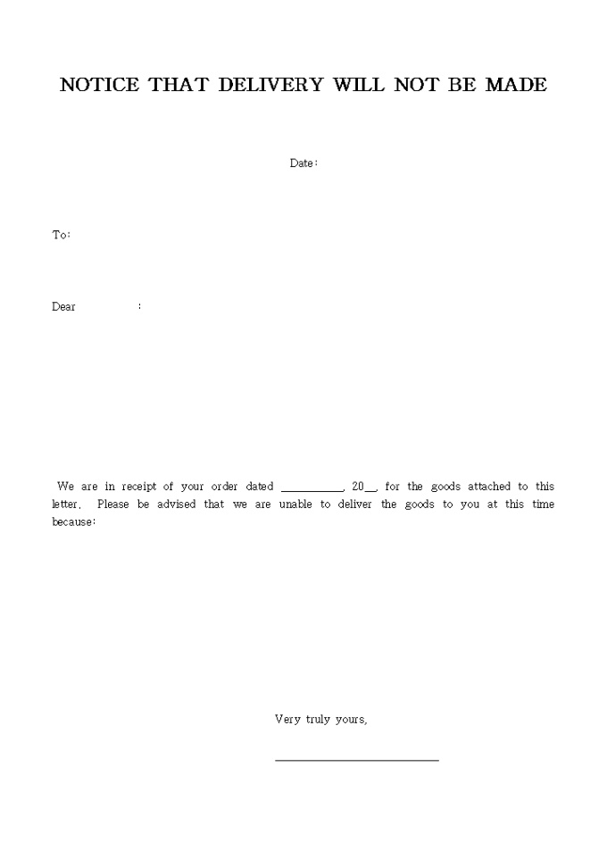 NOTICE THAT DELIVERY WILL NOT BE MADE입니다. 아래는 전체내용중 일부분입니다. We are in receipt of your order dated ___________, 20__, for the goods attached to this letter. Please be advised that we are unable to