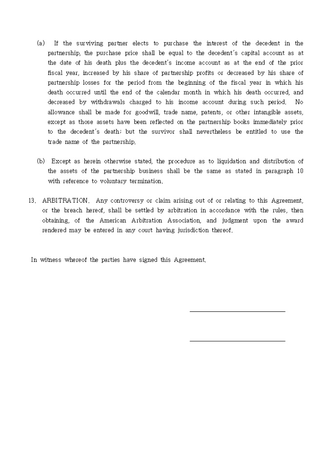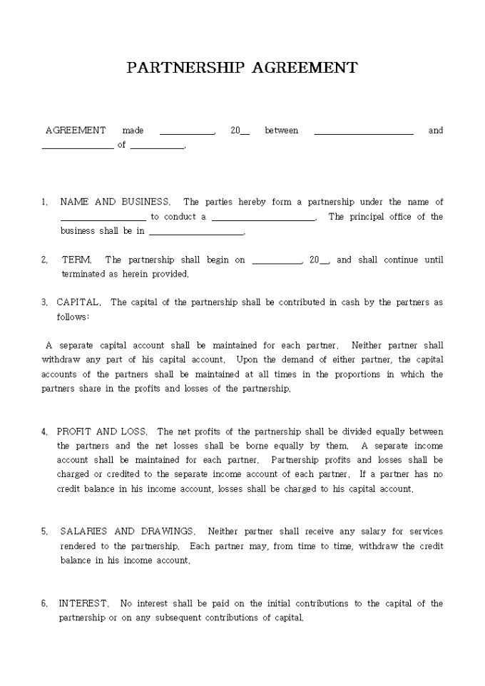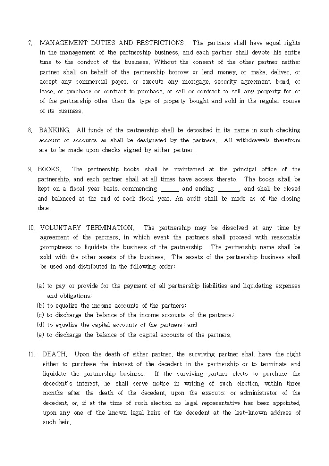 PARTNERSHIP AGREEMENT입니다. 아래는 전체내용중 일부분입니다. 1. NAME AND BUSINESS. The parties hereby form a partnership under the name of ___________________ to conduct a _______________________. The principal office of the business shall