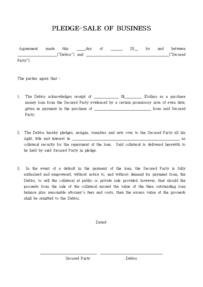9,000원/월PLEDGE-SALE OF BUSINESS입니다.아래는 전체내용중 일부분입니다. 1. The Debtor acknowledges receipt of _____________ ($_________ )Dollars as a purchase money loan from the Secured Party evidenced by a certain promissory note of even date, given