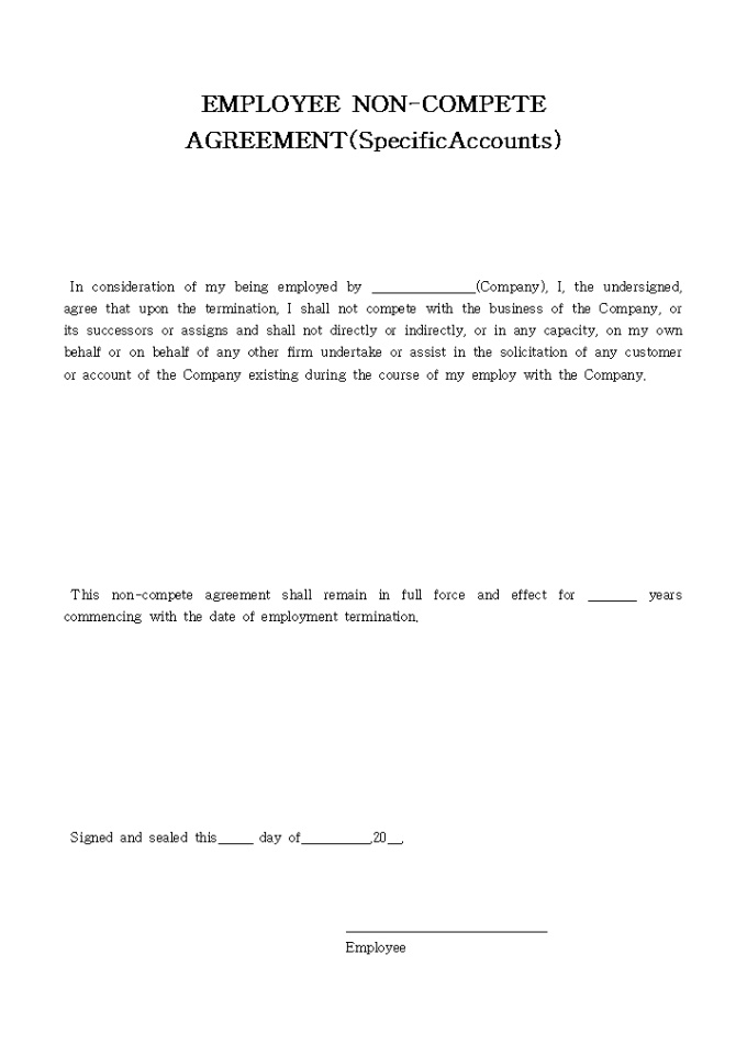 EMPLOYEE NON-COMPETE AGREEMENT(Specific Accounts)입니다. 아래는 전체내용중 일부분입니다. In consideration of my being employed by _______________ (Company), I, the undersigned, agree that upon the termination, I shall not co