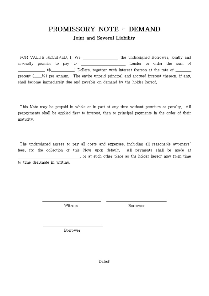 9,000원/월PROMISSORY NOTE - DEMAND입니다. 아래는 전체내용의 일부분입니다. FOR VALUE RECEIVED, I, We __________________, the undersigned Borrower, jointly and severally promise to pay to _______________________ Lender or order the sum of ______________ ($____________) Dollars,