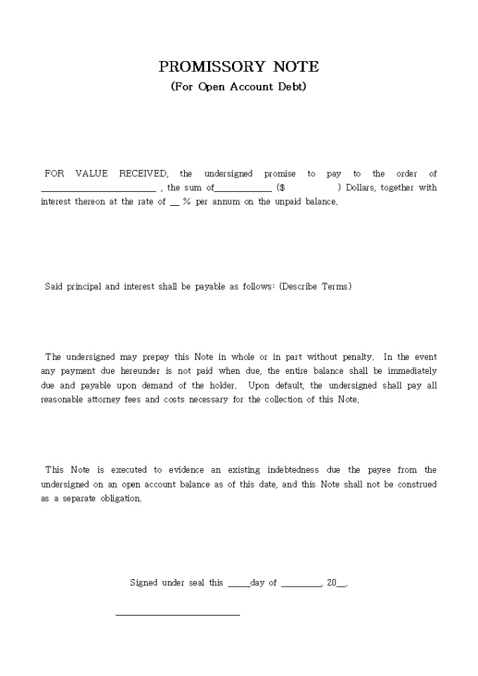 9,000원/월PROMISSORY NOTE(open account debt)입니다. 아래는 전체내용의 일부분입니다. FOR VALUE RECEIVED, the undersigned promise to pay to the order of __________________________ , the sum of_____________ ($ ) Dollars, together with interest thereon