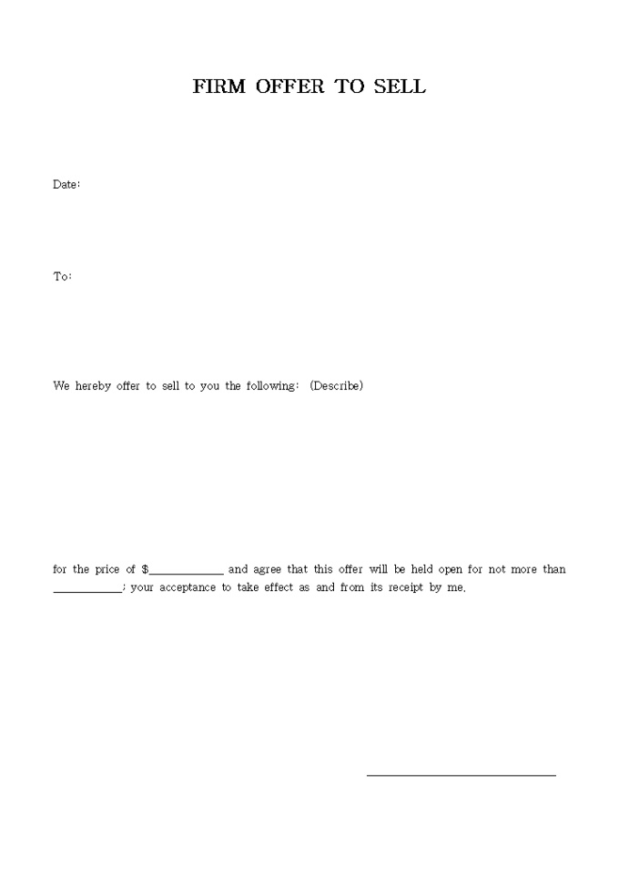 FIRM OFFER TO SELL입니다. 아래는 전체문서중 일부분입니다. We hereby offer to sell to you the following: (Describe) for the price of $_____________ and agree that this offer will be held open for not more t
