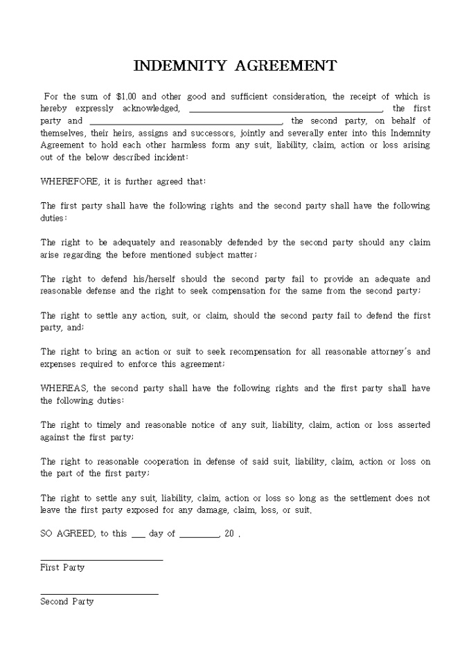 9,000원/월INDEMNITY AGREEMENT입니다. 아래는 전체내용중 일부분입니다. For the sum of $1.00 and other good and sufficient consideration, the receipt of which is hereby expressly acknowledged, ____________________________________________, the first party and __________________