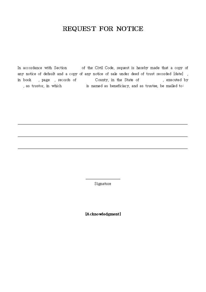 REQUEST FOR NOTICE입니다. 아래는 전체내용의 일부분입니다. In accordance with Section of the Civil Code, request is hereby made that a copy of any notice of default and a copy of any notice of sale under deed of trust recorded