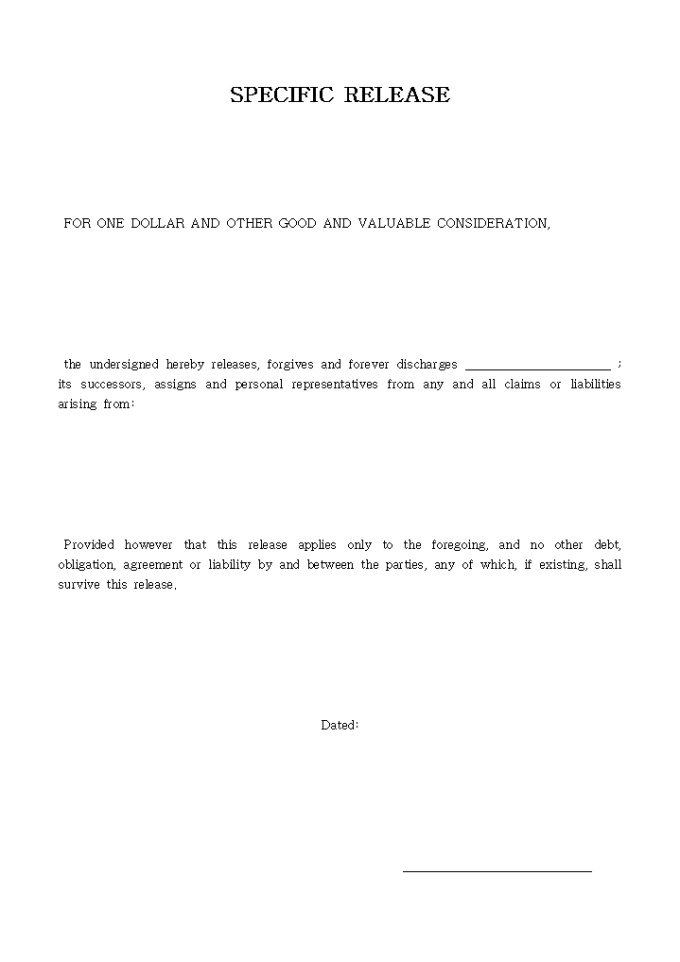 SPECIFIC RELEASE입니다. 아래는 전체내용의 일부분입니다. FOR ONE DOLLAR AND OTHER GOOD AND VALUABLE CONSIDERATION, the undersigned hereby releases, forgives and forever discharges