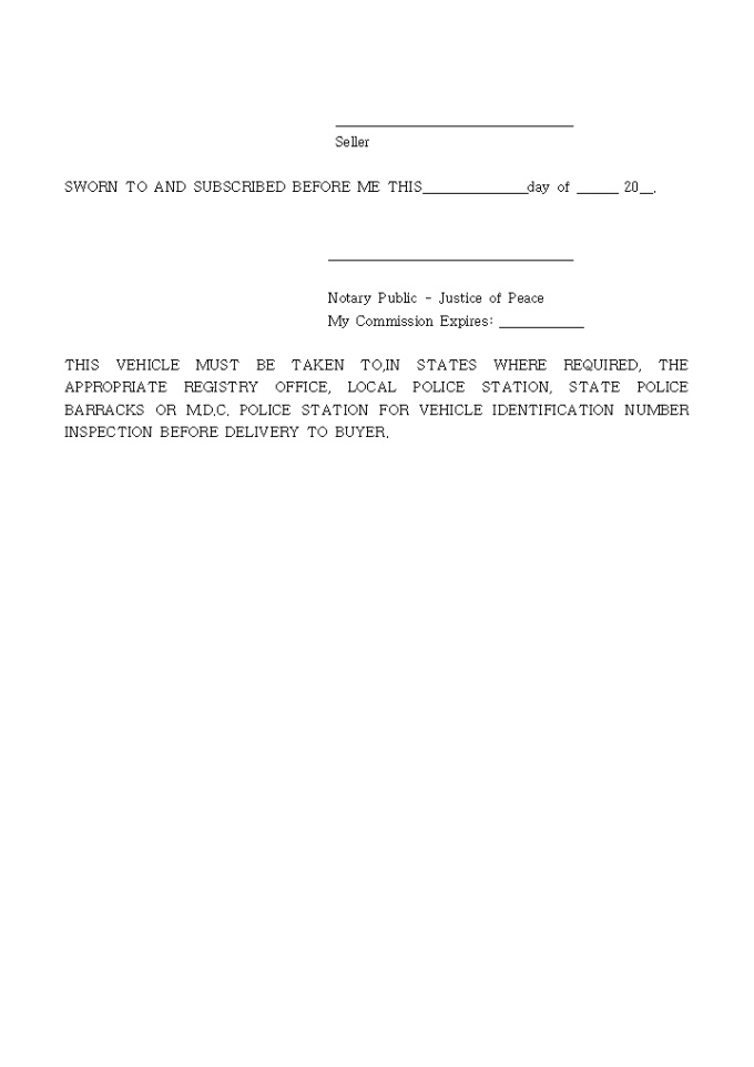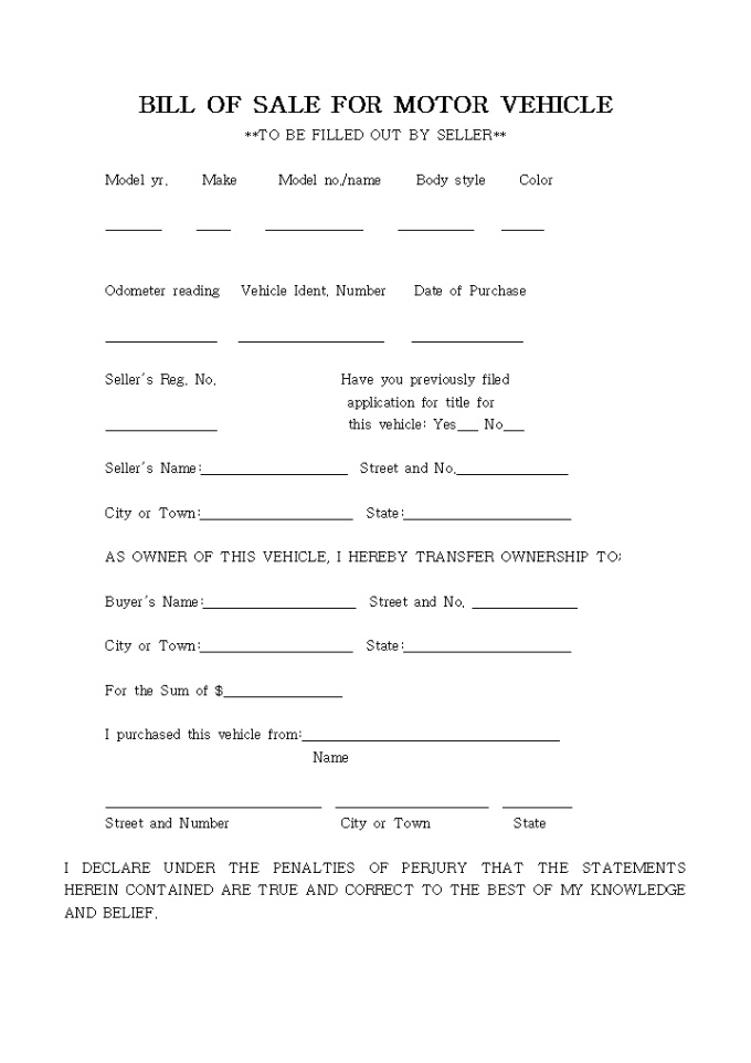 BILL OF SALE FOR MOTOR VEHICLE 양식입니다. 아래는 전체내용중 일부분입니다. Model yr. Make Model no./name Body style Color ________ _____ ______________ ___________ ______ Odometer reading Vehicle Ident. Number Date of