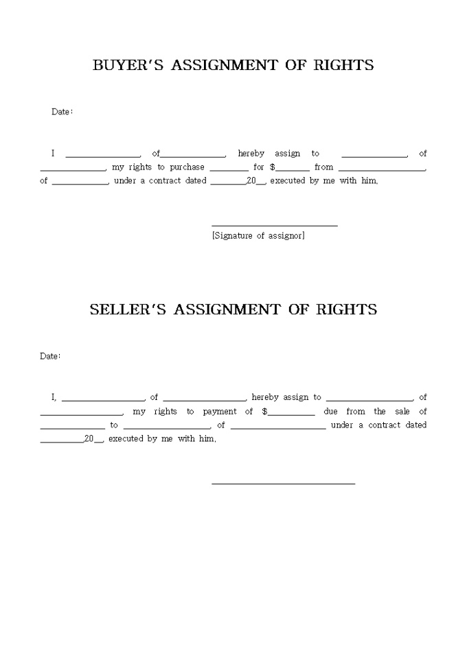 BUYER"S ASSIGNMENT OF RIGHTS 양식입니다. 아래는 전체내용중 일부분입니다. I _________________, of_______________, hereby assign to _______________, of _______________, my rights to purchase _________