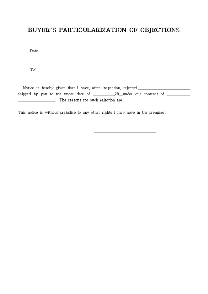 BUYER"S PARTICULARIZATION OF OBJECTIONS 양식입니다. 아래는 전체내용중 일부내용입니다. Notice is hereby given that I have, after inspection, rejected:___________________________________________________ _______________________________________shipped
