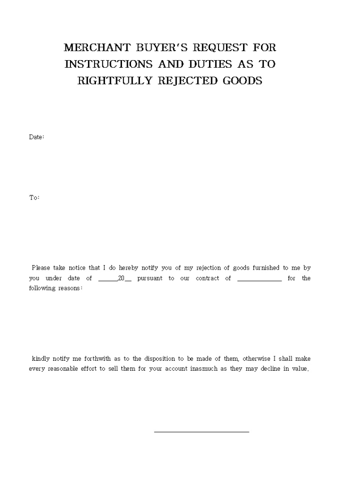 MERCHANT BUYER"S REQUEST FOR INSTRUCTIONS AND DUTIES AS TO RIGHTFULLY REJECTED GOODS입니다. 아래는 전체내용중 일부분입니다. Please take notice that I do hereby notify you of my rejection of goods furnished to me by you under date of ______,20__ pur