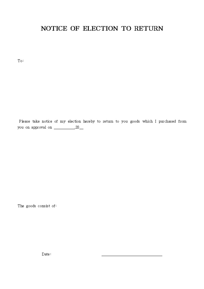 NOTICE OF ELECTION TO RETURN입니다. 아래는 전체내용중 일부분입니다. Please take notice of my election hereby to return to you goods which I purchased from you on approval on ___________,20__ The goods consist of: