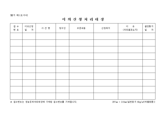 접수번호, 이의신청일자, 사건명, 청구인, 주문내용, 신청취지, 이유(처리결과요지), 결정통지 일자 등을 기재합니다.