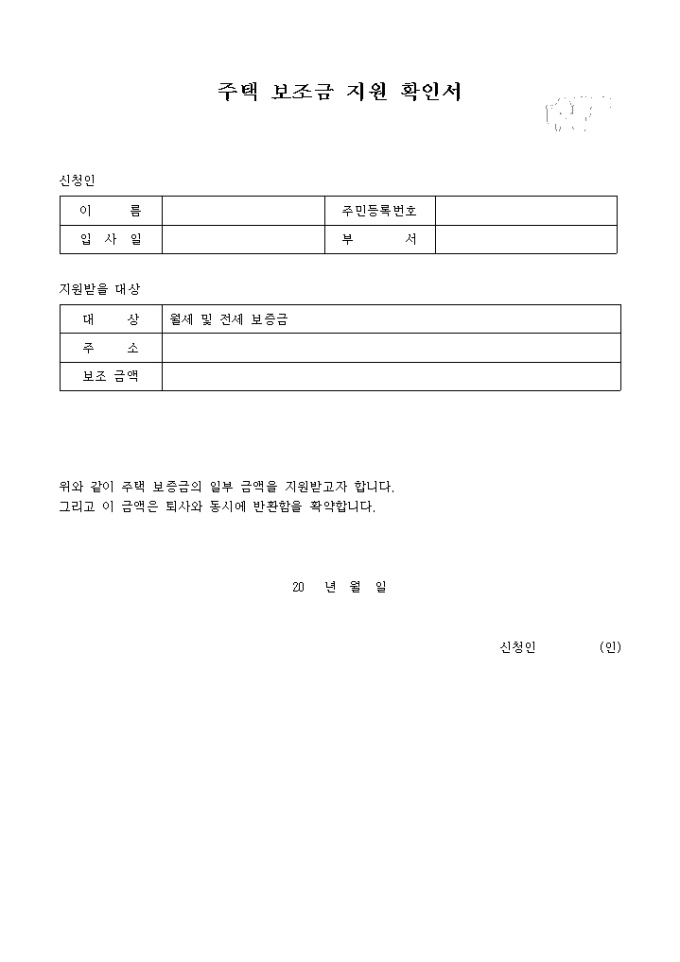9,000원/월고용주가 사원의 주택(월세,전세 보증금 등) 보조금을 지원해주시면 퇴사시 반환함을 확인하는 서식입니다.