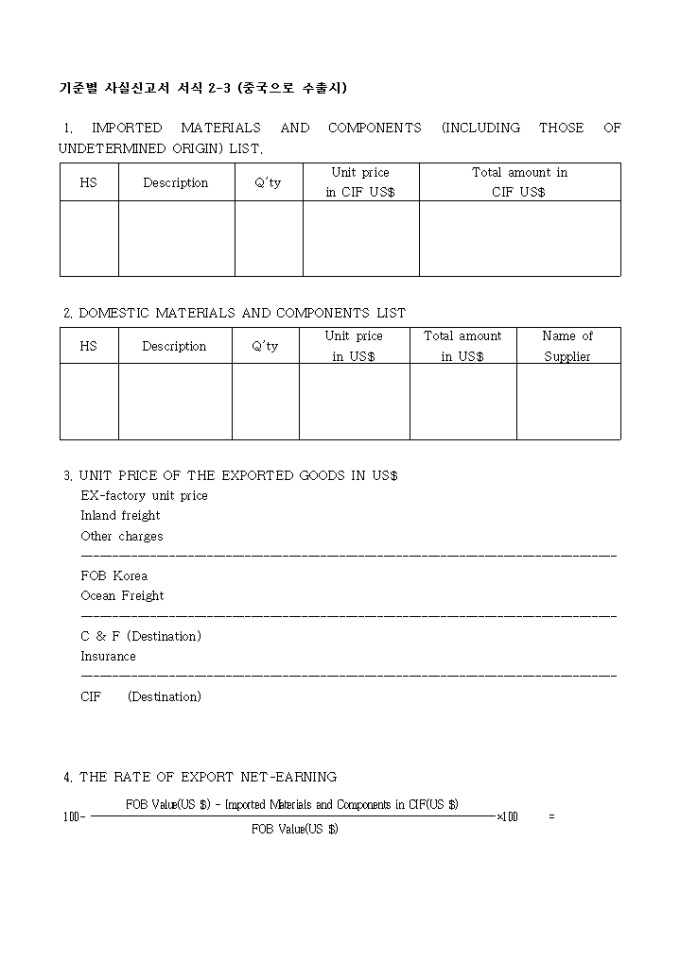 기준별 사실신고서 서식 2-3(중국으로 수출시)