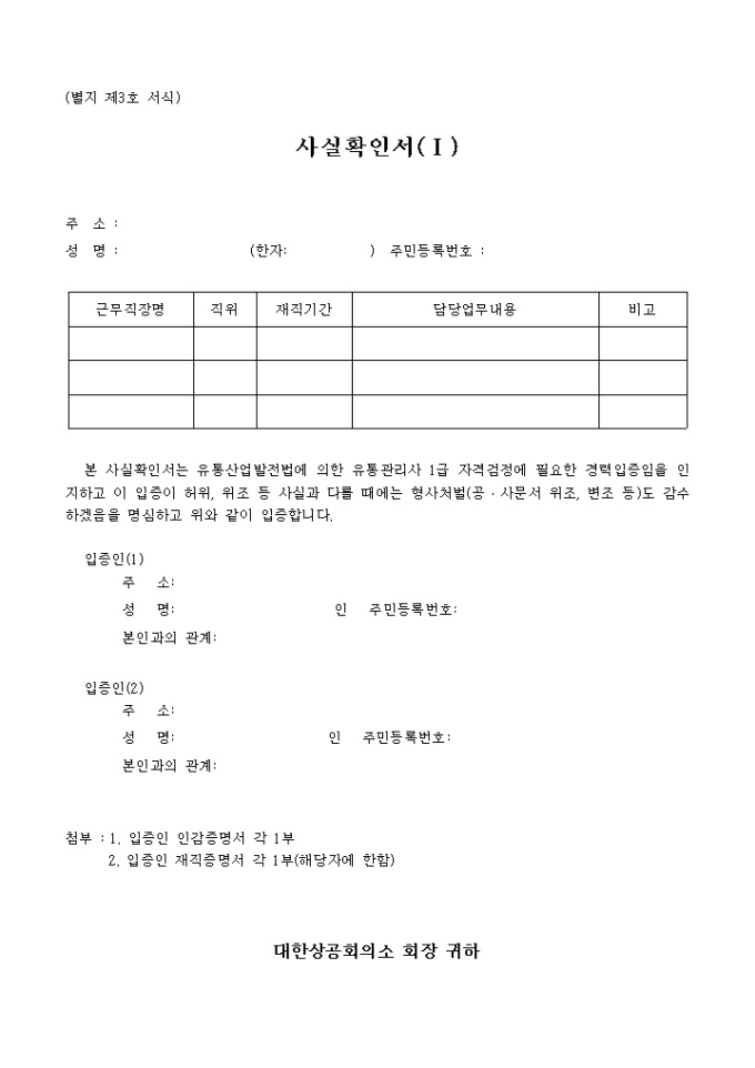 유통관리사1급 사실확인서1(별지 제3호서식)