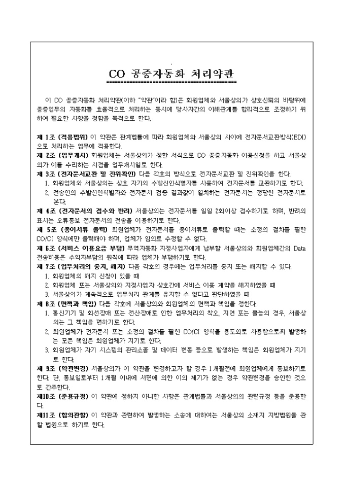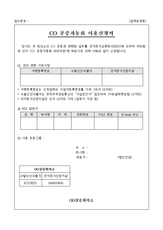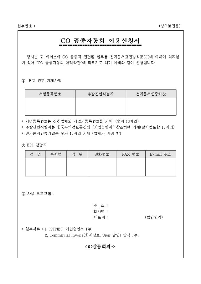 9,000원/월회의소의 CO 공증과 관련된 업무를 전자문서교환방식(EDI)에 의하여 처리하기 위한 CO 공증자동화 이용 신청서 입니다. 업체보과용 상의보관용 총 4페이지로 구성되어 있습니다.