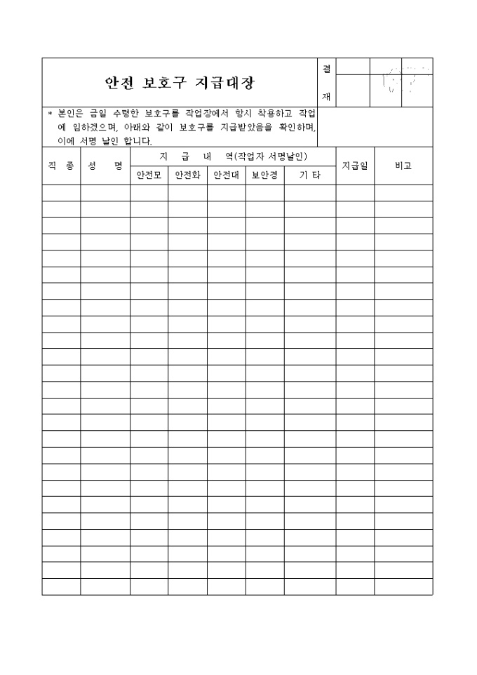 9,000원/월안전모,안전화,안전대,보안경,기다 보호장비를 지급확인하는 대장입니다.
