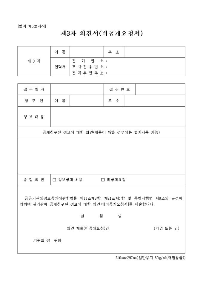 제3자 의견서(비공개요청서)(2004.1.29.개정)(별지 제5호서식)