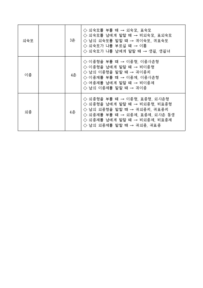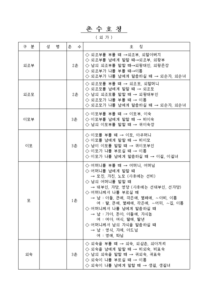 외가에 대한 촌수관계에 내가 부를때, 남에게 말할때, 나를 부를때, 나를 남에게 말할때 등 촌수 호칭에 대해 기술해 놓은 서식입니다.
