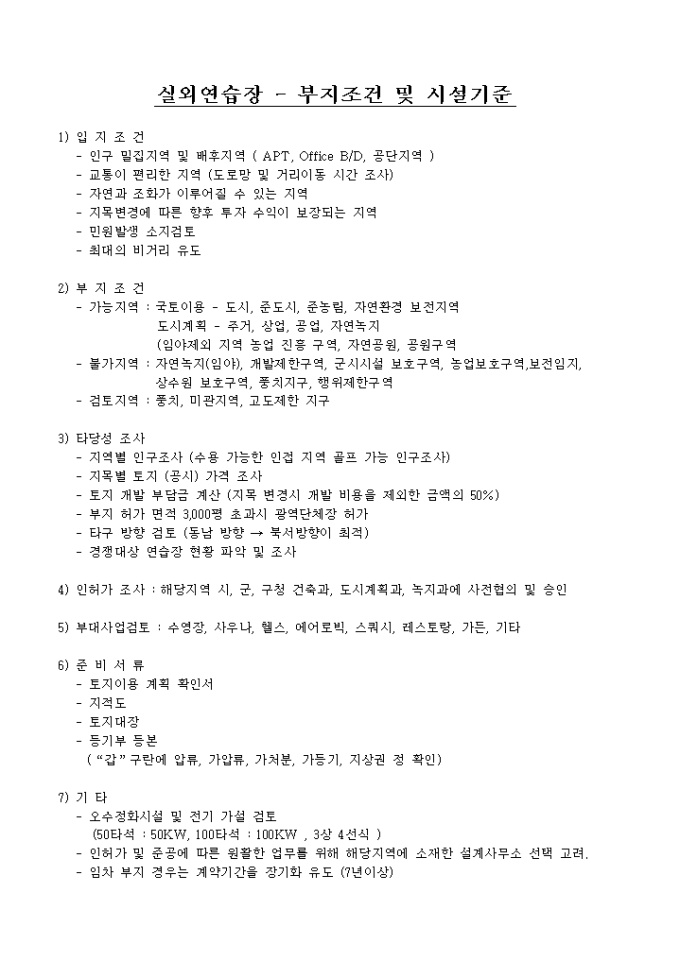 실외골프연습장 입지조건 및 부지조건, 타당성 조사등 골프실외연습장부지조건및시설기준에 대한 양식입니다.