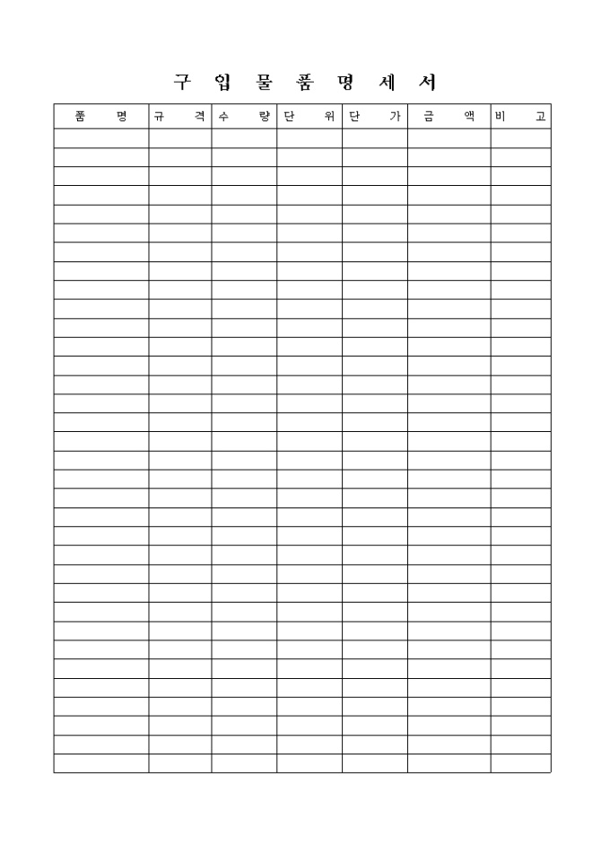 구입한 물품의 품명, 규격, 수량, 단위, 단가, 금액, 비고 등을 기재 할 수 있는 형식으로 구성되어 있는 명세서 입니다.