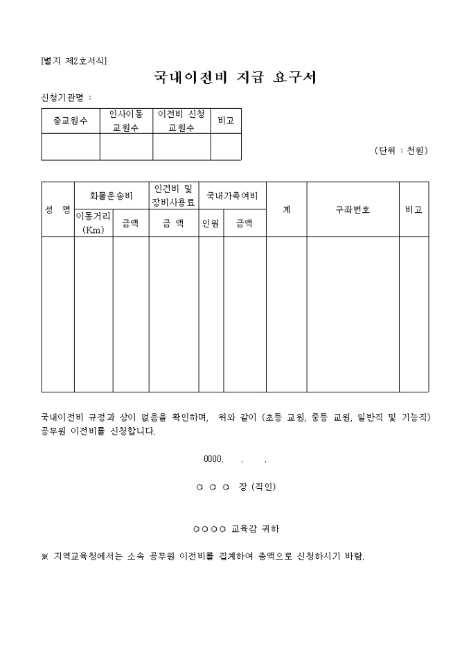 국내이전비 지급 요구서