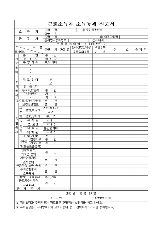 근로소득자의 인적사항, 근무처, 해당년도에 소득공제 내역등을 기재 할 수 있는 형식으로 구성되어 있는 근로소득자 소득공제 신고서 입니다.