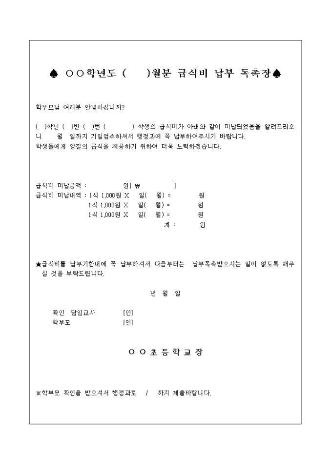 9,000원/월급식비 미납 학생의 미납된 내역을 알리고 급식비 납부를 촉구하기 위한 내용으로 구성되어 있는 급식비 납부 독촉장 입니다.