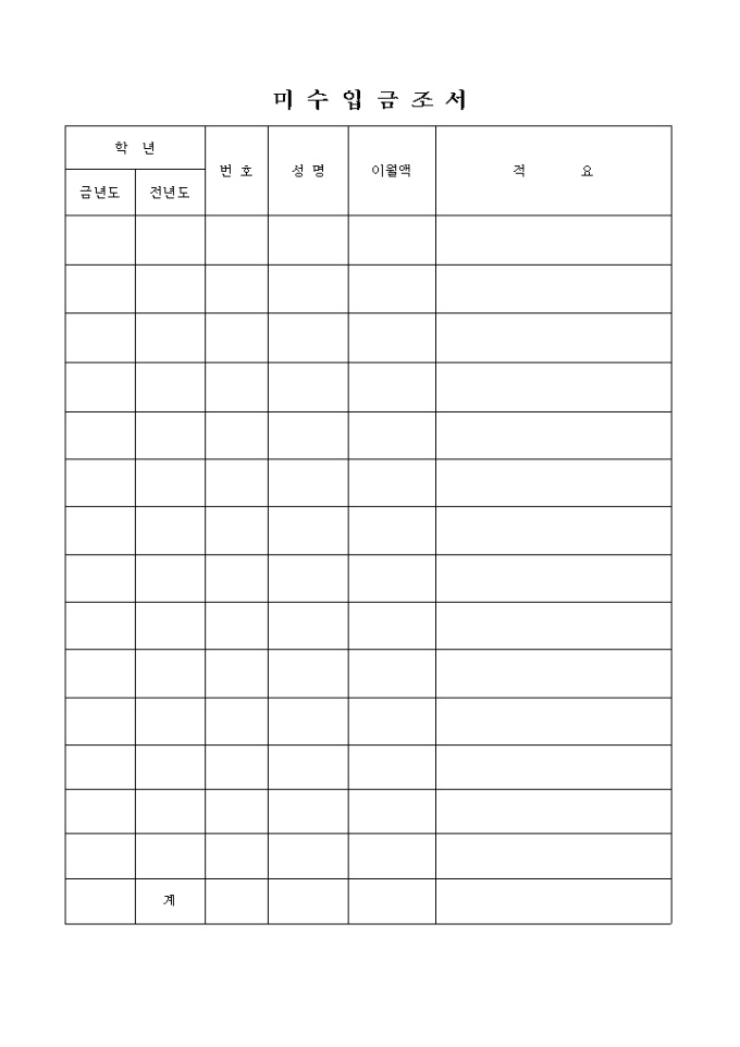 9,000원/월금년도와 전년도, 번호, 성명, 이월액, 적요를 기재할 수 있는 항목으로 구성되어 있는 미수입금 조서 양식입니다.