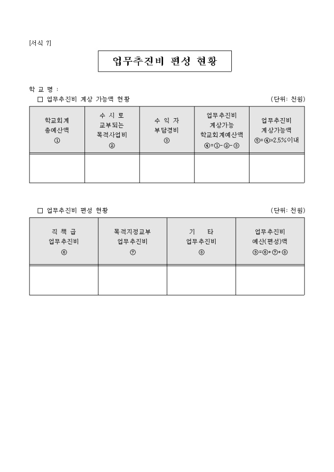 학교명, 학교회계 총예산액, 수시로 교부되는 목적사업비 등의 업무추진비 계상 가능액 현황과 업무추진비 편성 현황으로 구성되어 있는 업무추진비 편성 현황 양식 입니다.