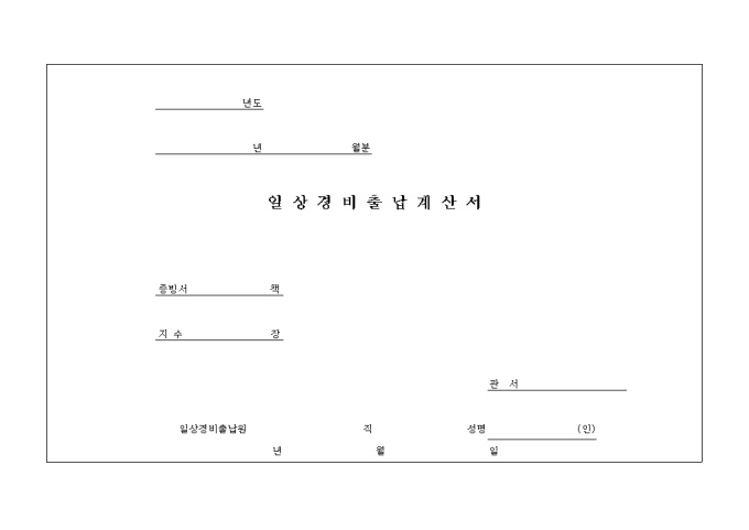 관리년도, 증비서, 장수, 담당부서와 담당자를 기재할 수 있는 가로형식의 일상경비출납계산서 표지입니다.