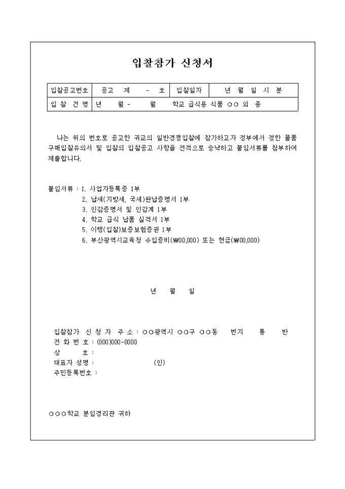 일반경쟁입찰에 참가하고자 정부에서 정한 물품구매입찰유의서 및 입찰의 입찰공고 사항을 전적으로 승낙하고 붙임서류를 첨부하여 제출한다는 내용을 입찰 참가 신청서 양식 입니다.