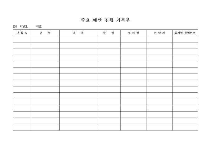 일자, 건명, 내용, 금액, 업체명, 연락처, 회계명-증빙번호의 항목으로 구성되어 있는 가로형식의 주요예산 집행 기록부 양식 입니다.