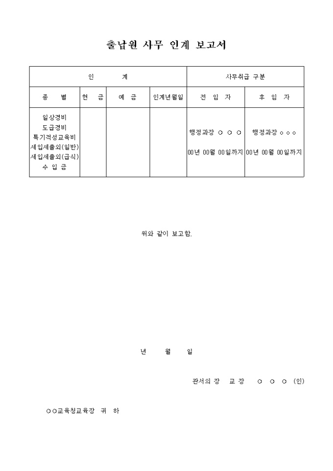 9,000원/월종별, 현금, 예금, 인계일자, 일상결비, 도급경비, 특기적성교육비, 세입세출외(일반), 세입세출외(급식), 수입금, 사무취급 구분으로 구성되어 있는 출납원 사무인계 보고서 양식 입니다.
