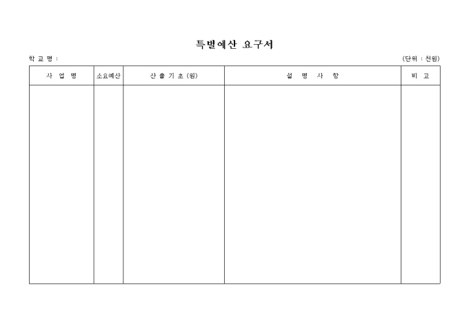 학교명, 사업명, 소요예산, 산출기초, 설명사항, 비고란으로 구성되어 있는 특별예산 요구서 양식 입니다.