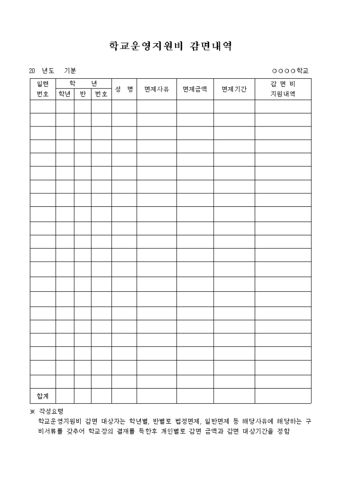 9,000원/월학교 운영 지원비의 감면 내역을 정리하는 양식으로써 다음의 내용은 작성요령 입니다. 학교운영지원비 감면 대상자는 학년별, 반별로 법정면제, 일반면제 등 해당사유에 해당하는 구비서류를 갖추어 학교장의 결재를 득한후 개인별로 감면 금액과 감면 대상기간을 정합니다.