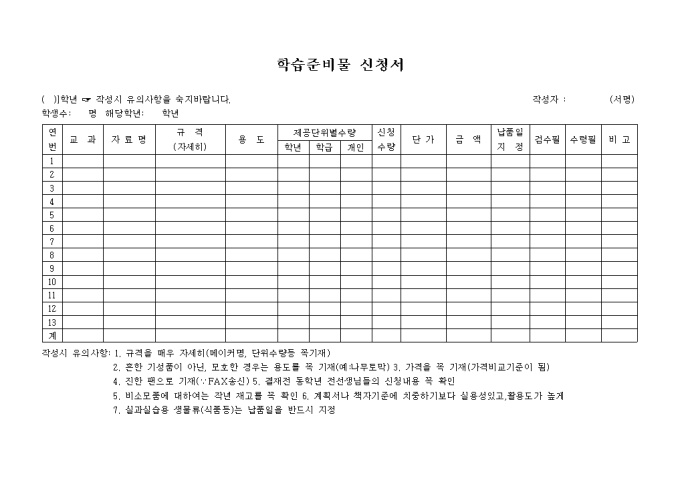 연번, 교과, 규격, 용도, 제공단위별 수령, 신청수량, 단가, 금액, 납품일 지정등의 항목으로 구성되어 있는 학습 준비물 신청서로써 문서 맨하단에 기재된 작성요령을 숙지해 주시기 바랍니다.