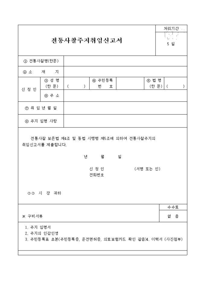9,000원/월전통사찰 보존법 제4조 및 동법 시행령 제5조에 의하여 전통사찰주지의취임신고서를 제출할때 사용합니다.
